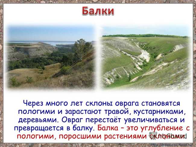 Балки, напротив, характерны для степных и полупустынных районов. Они образуются в результате эрозии ветров и воды. Балки обладают более вертикальным размещением, чем овраги, и имеют более широкие размеры. Они образуются в результате вымывания почвы водными потоками или ветровым эрозией. Балки часто встречаются в регионах с недостатком растительности.