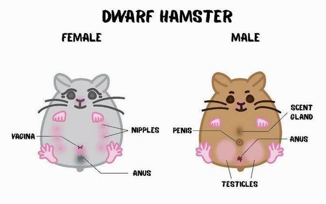 Следует обратить внимание на наличие сосочков, наиболее густую растительность у мальчика, размер особи и расположение половых органов. У самок хомяков расстояние между мочевыводящими путями и анусом всегда минимально