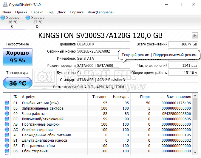 Далее в графе “Режим передачи” можно посмотреть информацию о том, какое рекомендуется для диска подключение, и какое он в данный момент используется. До вертикальной черточки указана информация о том, к какому интерфейсу диск сейчас подключен — SATA 2 (SATA/300) или SATA 3 (SATA/600), а после черточки информация о том, какой потенциал диска. Если значения одинаковые или второе значение меньше первого, это указывает на то, что SATA разъем выбран правильно.