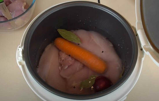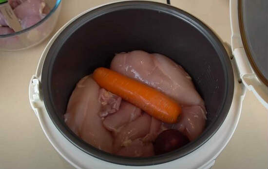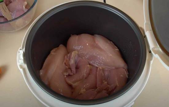 1. Курочку мы берем без кости и кожи. В данном случае, присутствует грудка и бедра. Промываем куски, отправляем в чашу мультиварки.