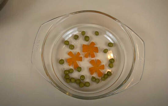 9. Подготавливаем судочек или другую посуду для заливного. Сюда сразу можно выкладывать мясо, но я предлагаю более праздничный вариант. Из отварной и отложенной морковки вырезаем цветочки, звездочки, сердечки – все, что душе угодно. Кладем на дно посуды.