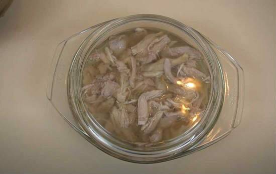- Небольшое количество бульона, примерно полстакана отольем отдельно и остужаем до комнатного состояния.
