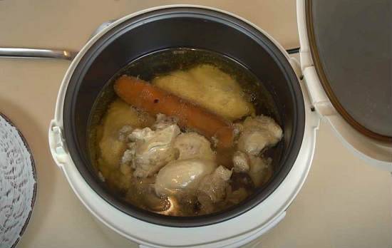 - Через час от начала варки наступает черед рубленой птицы, мякоти на кости.