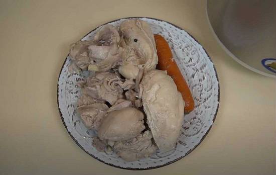 8. Достаем курицу и морковку. Выкладываем их на тарелку, остывать. Луковицу тоже извлекаем, но ее можно выбросить, она нам не пригодится.