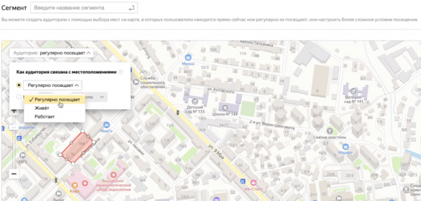 Одним из плюсов контекстной рекламы является то, что мы можем дополнительно выделить более интересную нам аудиторию по географическому признаку. Например, если нам необходимы люди, пользующиеся услугами какого-то фитнесс центра или ТЦ, посещающие конкретные магазины, живущие в определенном ЖК, мы можем выделить их в отдельную группу с помощью создания сегмента в аудиториях Яндекса.