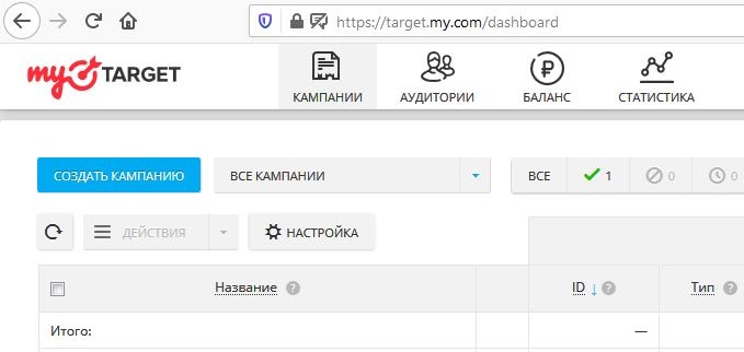 Настройки в рекламном кабинете MyTarget выглядят так: