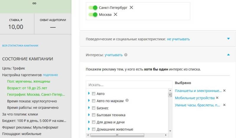 Приведем примеры настройки таргетированной рекламы в соцсетях для нового продукта – мобильного гаджета из примера выше. Настраиваем географию (Москва и Санкт-Петербург), возраст (от 18 до 25 лет) и интересы пользователей (Смартфоны и Планшеты).