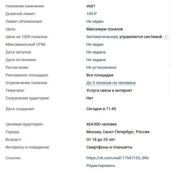 Этих значений достаточно, чтобы на первоначальных этапах оценить результативность кампании.