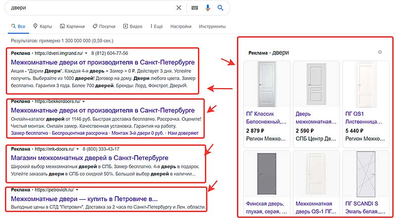 В случае с объявлениями в поиске, реклама показывается в ответ на запрос, сбоку или в середине выдачи. Она может быть похожа на обычный сниппет сайта из поиска или быть выполненной в виде баннера с красочной картинкой.