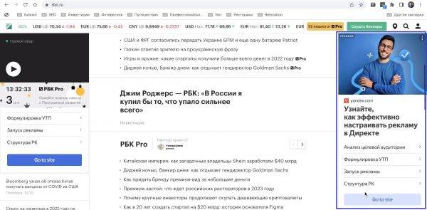 Реклама в РСЯ показывается пользователю исходя из его ранее просмотренных страниц. Также она может подходить по тематике с открытым сайтом. Она может транслироваться в середине статьи на странице или сбоку от текста, быть в форме баннера с картинками или даже в виде рекламного ролика.
