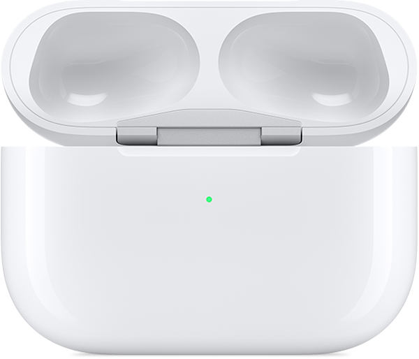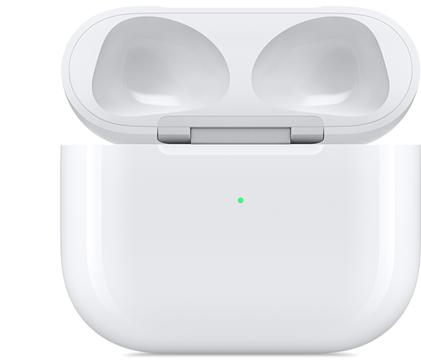 Зарядный футляр MagSafe для AirPods (3-го поколения) совместим с беспроводными зарядными устройствами стандарта Qi и может выравнивать положение с помощью магнитов при использовании зарядных устройств, совместимых с MagSafe. В нижней части футляра расположен разъем Lightning для подключаемой зарядки. Индикатор состояния находится на лицевой стороне футляра, а серийный номер — на обратной стороне крышки.