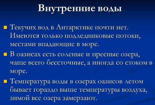 На материковой части Антарктики имеются озера и подледниковые воды. Реки и грунтовые воды отсутствуют. Главный запас пресной воды – это ледниковая шапка. В летний период происходит испарение влаги, а в зимний наблюдается конденсация.