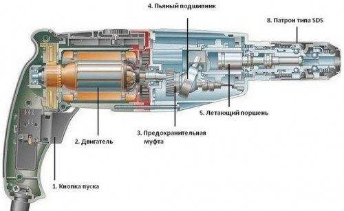 У перфоратора таких недостатков нет. В основном потому, что его устройство сильно отличается от дрели. В некоторых деталях его механизм очень похож на устройство автоматического оружия. Особенно он отличается при работе на твердых материалах. У него меньше отдача и выше скорость прохождения. Однако расходные материалы для этого инструмента дороже, нежели для дрели.