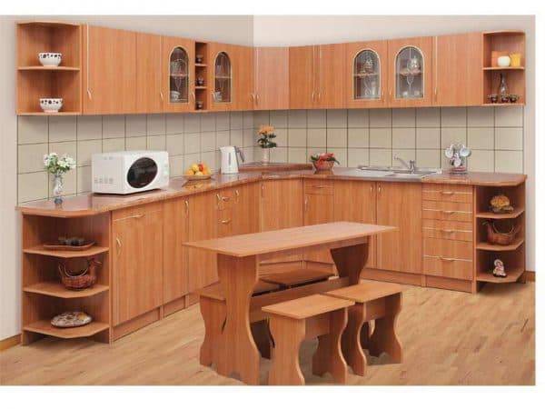Плита ДСП по своим характеристикам имеют хорошие показатели в прочности и теплоизоляционные и звукоизоляционные характеристики, по некоторым показателям ДСП превосходит даже натуральную древесину. Одним из преимуществ ДСП состоит в том, что – это очень недорогая цена кухни из ДСП, с учетом того, что сама мебель выдерживает высокие нагрузки, неприхотлива в эксплуатации. К недостатукам кухни из ДСП можно отнести ее ограниченное применение в помещениях с повышенной влажностью, там существует серьезная опасность набухания плит и возможное их, в последствии, разрушение.