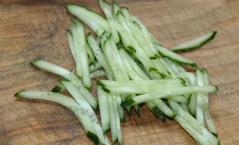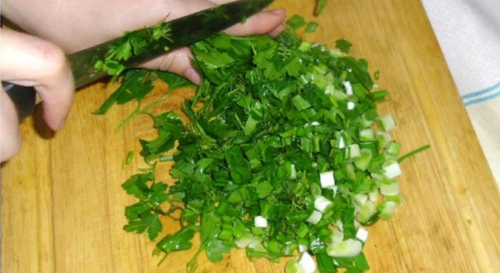 5. Пока он остужается, нарезаем огурец и зелень. Затем, добавляем ингредиенты в него и ставим в холодильник примерное на 1 час.