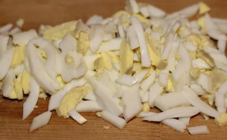 6. Берем яйца, отвариваем их и даем остыть, затем нарезаем произвольно, можно просто кубиками, можно соломинкой.