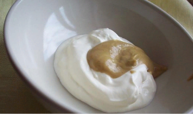 7. Сметану и горчицу смешиваем. По вкусу добавляем нужное количество горчицы. Кто любит поострее, кладите больше горчицы.