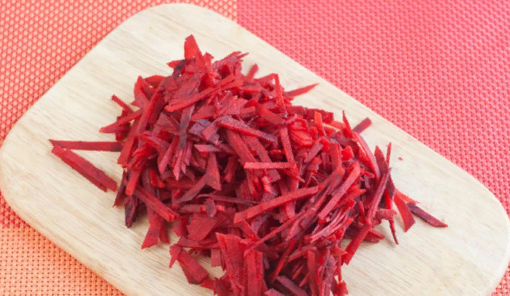 - Нарежьте свеклу кубиками или тонкой соломкой.