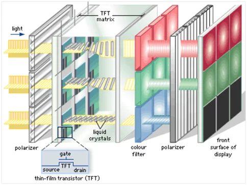 Сложная часть процесса начинается здесь: свет первоначально поляризуется, после чего он проходит через кристаллический слой, который меняет свою форму в зависимости от подаваемого напряжения. Это изменяет угол, под которым свет проходит через следующий поляризационный слой. На последнем этапе свет проходит через цветные фильтры (красный, зеленый или синий), и эти элементы объединяются в пиксели, чтобы создать изображение на экране.