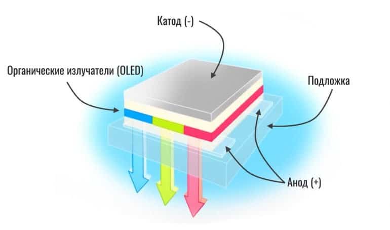 OLED-дисплеи имеют гораздо более простую структуру, чем ЖК-дисплеи. Их можно сравнить с «бутербродами» из нескольких десятков очень тонких слоев органических материалов. В зависимости от используемой технологии — RGB или RGBW — такие панели состоят из трех или четырех диодно-субпикселей: красного, зеленого и синего и, возможно, белого.