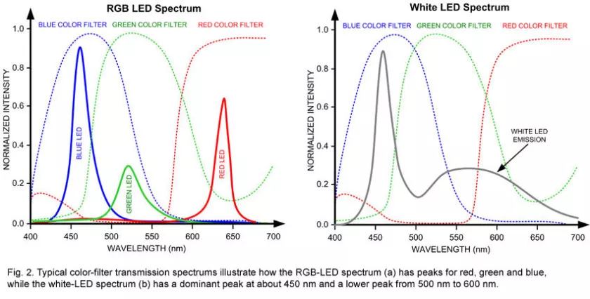 Спектральные характеристики одного «белого» светодиода не совпадают с белым светом, полученным от трех RGB светодиодов.