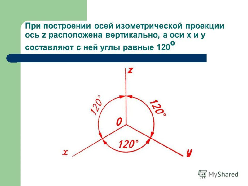 При построении осей изометрической проекции ось z расположена вертикально, а оси x и y составляют с ней углы равные 120 º