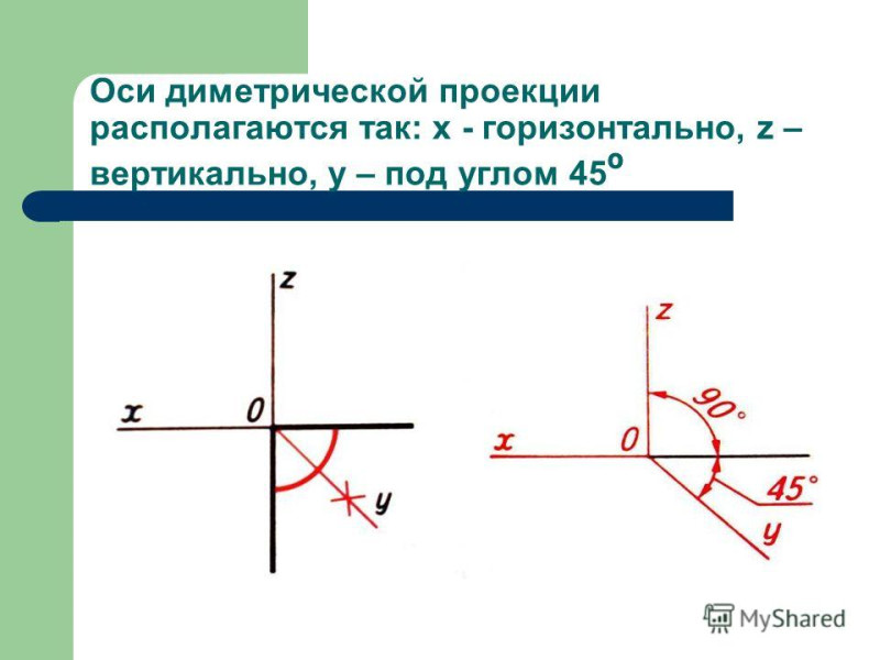 Оси диметрической проекции располагаются так: x – горизонтально, z – вертикально, y – под углом 45 º