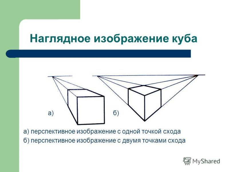 Наглядное изображение куба а) б) а) перспективное изображение с одной точкой схода б) перспективное изображение с двумя точками схода
