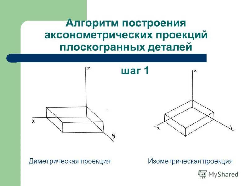 Алгоритм построения аксонометрических проекций плоскогранных деталей шаг 1 Диметрическая проекция Изометрическая проекция