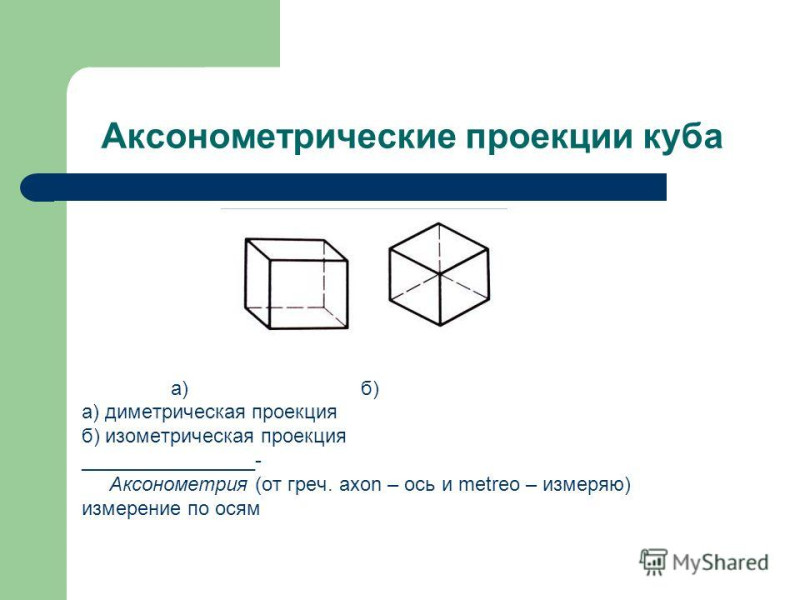Аксонометрические проекции куба а) б) а) диметрическая проекция б) изометрическая проекция ________________- Аксонометрия (от греч. аxon – ось и metreo – измеряю) измерение по осям