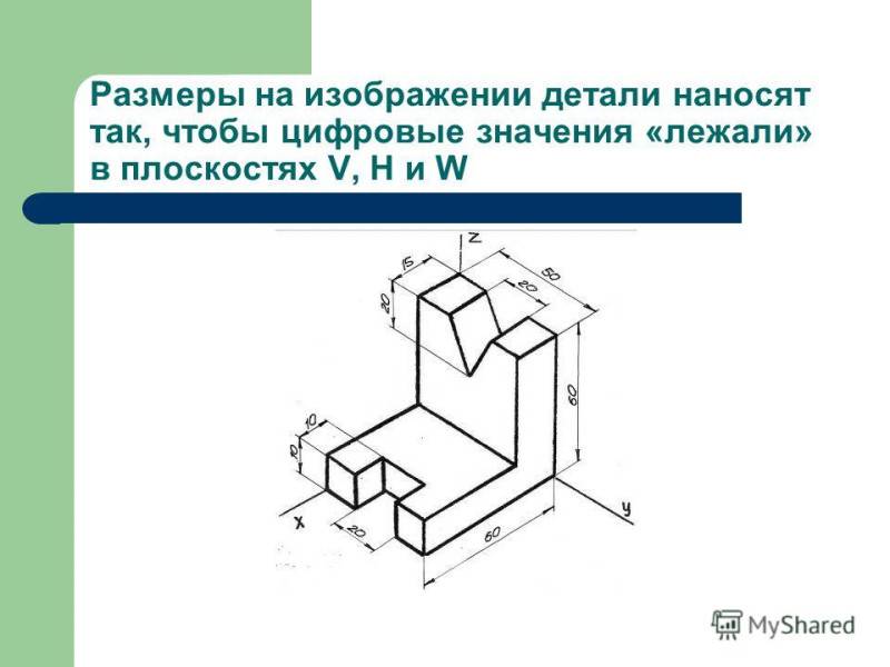 Размеры на изображении детали наносят так, чтобы цифровые значения «лежали» в плоскостях V, H и W