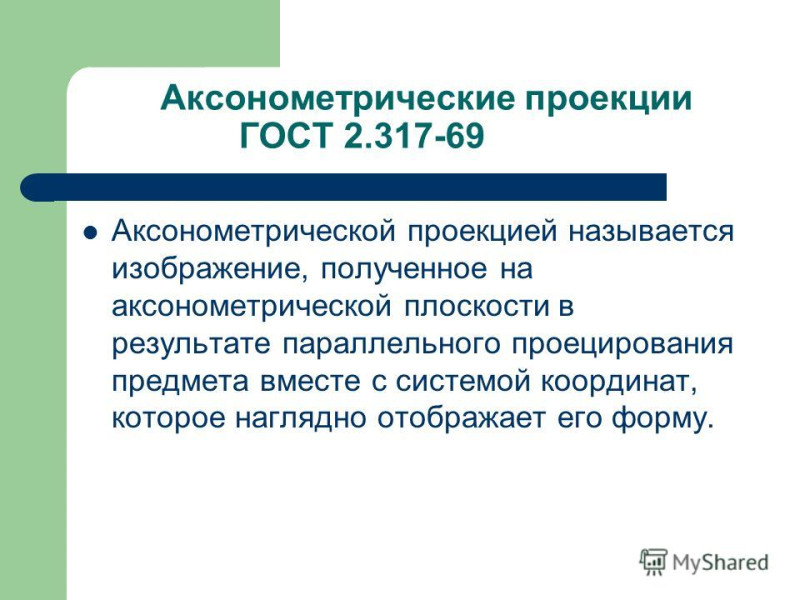 Аксонометрические проекции ГОСТ Аксонометрической проекцией называется изображение, полученное на аксонометрической плоскости в результате параллельного проецирования предмета вместе с системой координат, которое наглядно отображает его форму.