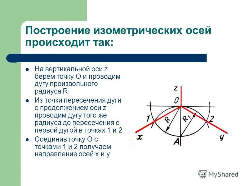 Построение изометрических осей происходит так: На вертикальной оси z берем точку О и проводим дугу произвольного радиуса R Из точки пересечения дуги с продолжением оси z проводим дугу того же радиуса до пересечения с первой дугой в точках 1 и 2 Соединив точку О с точками 1 и 2 получаем направление осей x и y