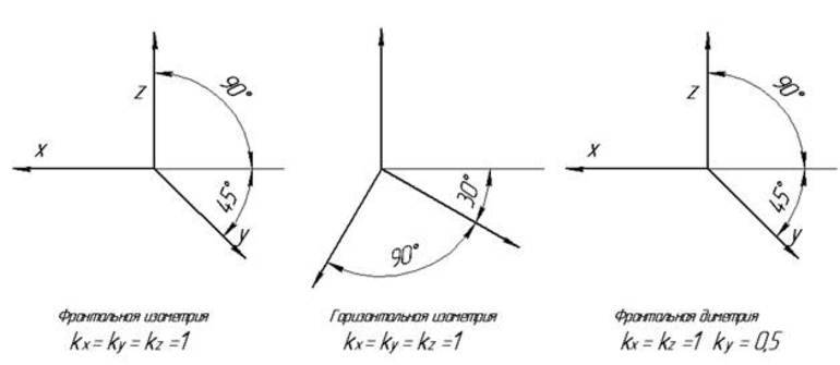 В зависимости от расположения координатных аксонометрических осей относительно аксонометрических проекций получаются различные аксонометрические проекции: прямоугольная изометрическая проекция (сокращенно — изометрия), прямоугольная диметрическая проекция (или диметрия), косоугольные фронтальная и горизонтальная изометрия и фронтальная диметрия.Например, в прямоугольной изометрической проекции оксонометрические оси располагаются по отношению друг к другу под углом 120°.Коэффициенты искажения различны в изометрических и диметрических аксонометрических проекциях. В изометрической проекции коэффициент (k) равен единице, т. е. по осям х, y, z выполняют проекцию без искажения. Диметрическая проекция выполняется с коэффициентом искажения (k) по оси y, равным 0,5, а по осям z и х — равным единице.