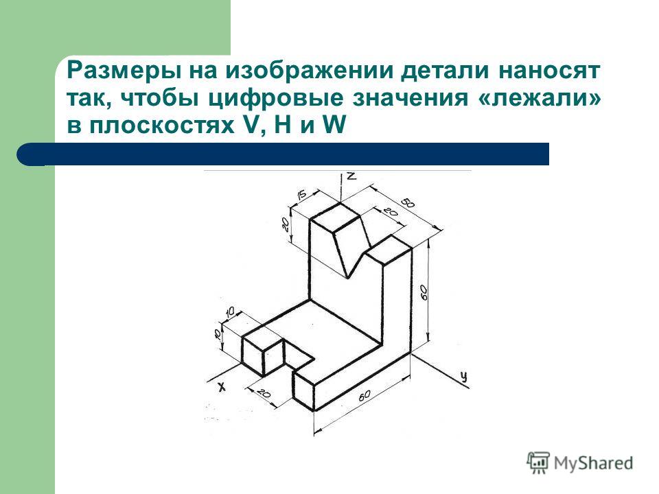 Размеры на изображении детали наносят так, чтобы цифровые значения «лежали» в плоскостях V, H и W