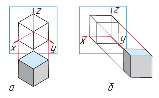 Рис. 83. Образование аксонометрических проекций: а и б – фронтальной ди-метрической; в и г – изометрической