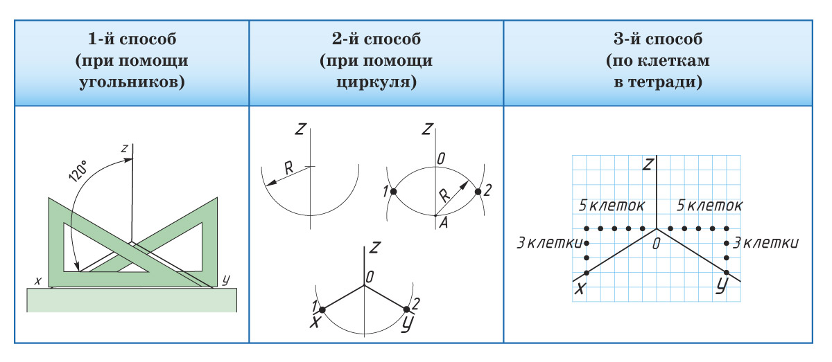 Наиболее распространенными являются прямоугольная изометрическая (прямоугольная изометрия) и косоугольная фронтальная диметрическая (фронтальная диметрия) проекции, в которых объект изображается в трех проекциях так, чтобы можно было хорошо увидеть его форму с трех сторон. Способы построения аксонометрических осей. При построении аксонометрических осей прямоугольной изометрии используют один из трех способов.