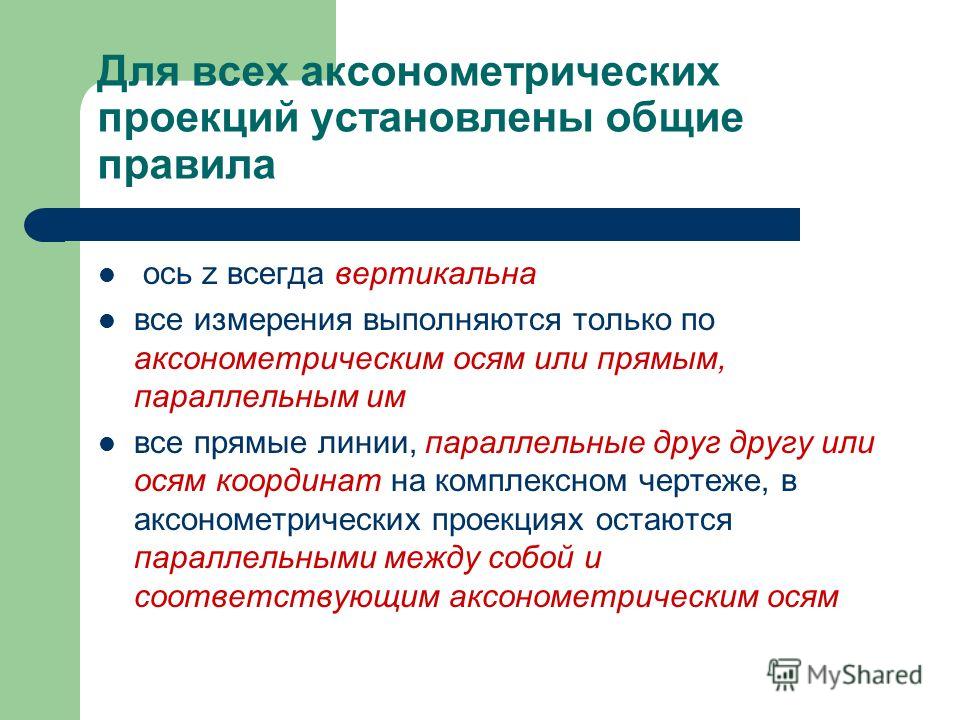 Для всех аксонометрических проекций установлены общие правила ось z всегда вертикальна все измерения выполняются только по аксонометрическим осям или прямым, параллельным им все прямые линии, параллельные друг другу или осям координат на комплексном чертеже, в аксонометрических проекциях остаются параллельными между собой и соответствующим аксонометрическим осям