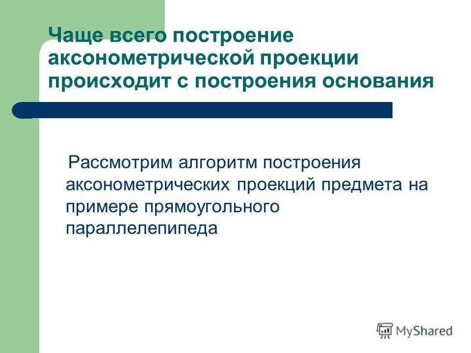 При построении аксонометрии предмета стремятся по возможности координатную плоскость xOy совместить с плоскостью основания предмета, а координатные оси – с его ребрами или осями симметрии.