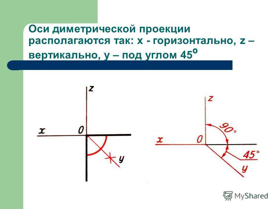 Оси диметрической проекции располагаются так: x – горизонтально, z – вертикально, y – под углом 45 º