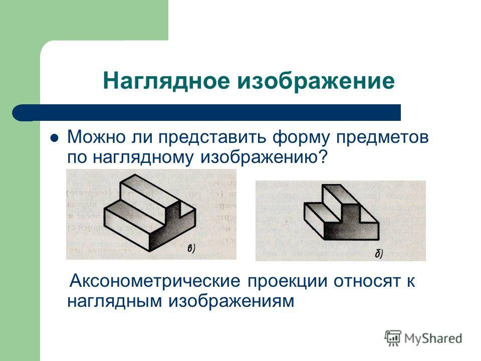 Наглядное изображение Можно ли представить форму предметов по наглядному изображению? Аксонометрические проекции относят к наглядным изображениям