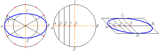 Диаметр окружности АВ делится на несколько равных частей, на рисунке 4.9,б их 4. Через точки 1-3 проводятся хорды параллельно диаметру CD. В любой аксонометрической проекции (например, в косоугольной диметрической) изображаются эти же диаметры с учетом коэффициента искажения. Так на Рисунке 4.9,б А1В1=АВ и С1 D1 = 0,5CD. Диаметр А 1В1 делится на то же число равных частей, что и диаметр АВ, через полученные точки 1-3 проводятся отрезки, равные соответственным хордам, умноженным на коэффициент искажение (в нашем случае – 0,5).