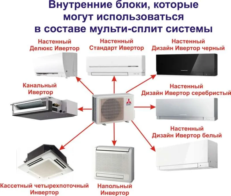 Также существуют мультисплит-системы, в составе которых имеется несколько внутренних блоков.