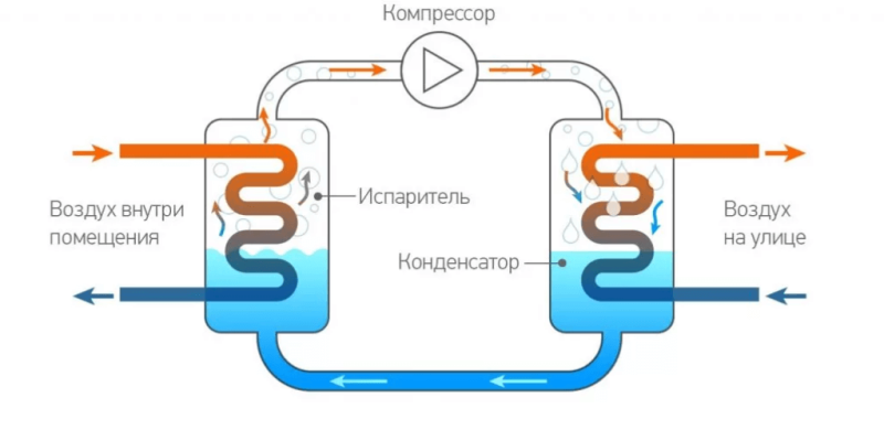 Работа бытовых двухблочных систем, как и любых холодильных агрегатов, возможна благодаря тому, что особые жидкости (хладагенты) при смене давления меняют свое агрегатное состояние. То есть, они превращаются в пар и конденсируются обратно; причем это происходит с поглощением или отдачей тепловой энергии. В итоге устройство, использующее эти физические процессы, охлаждает или обогревает комнату.
