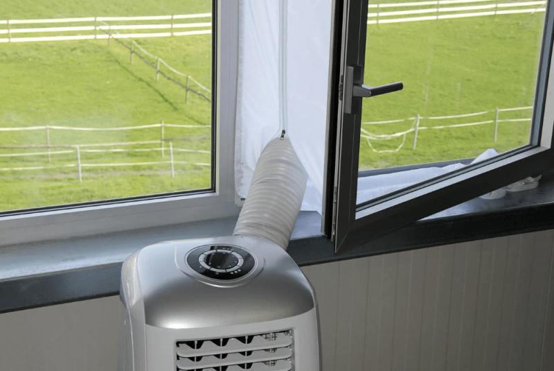В некоторых случаях, чтобы не делать дополнительных отверстий, воздуховод выпускают в приоткрытое окно, закрыв зазор специальной «шторкой». Этот вариант установки наиболее простой, но он уменьшает эффективность работы агрегата. Тепло снаружи довольно легко проникает через такую защиту. Поэтому остужать комнату придется дольше.