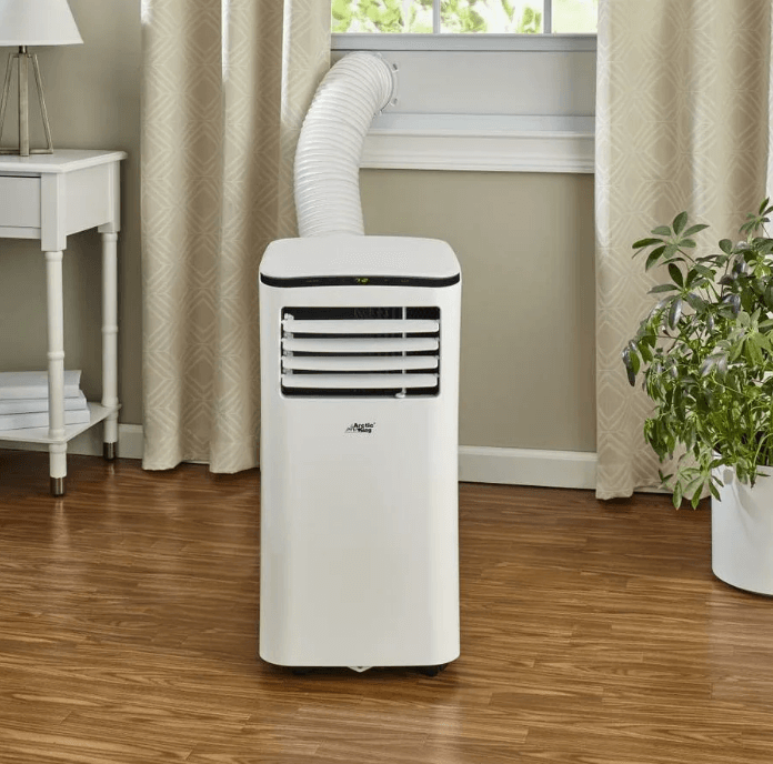 Мобильные приборы имеют дополнительные детали – гофрированный шланг для выведения конденсата на улицу и колесики для перемещения прибора.