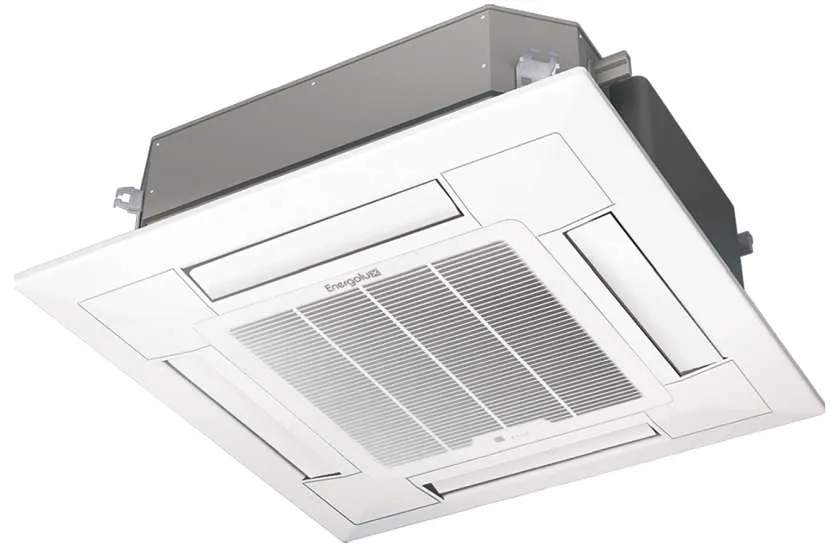 Кассетную модель стоит приобрести для помещения большой квадратуры с подвесным потолком. Для размещения внутреннего блока системы предусматривается межпотолочное пространство высотой минимум 25 см. Находящиеся в комнате люди видят только декоративную решетку.