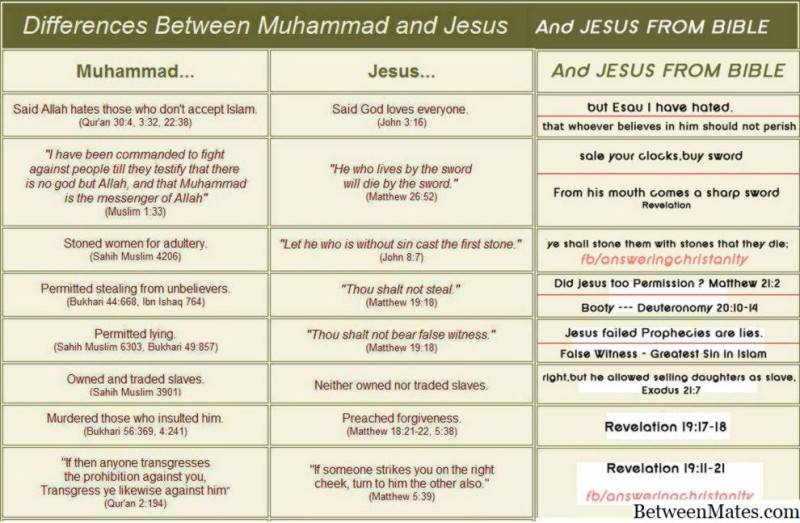 • Иисус был сыном Божьим согласно Библии, тогда как Иисус не был сыном Божьим согласно Корану.