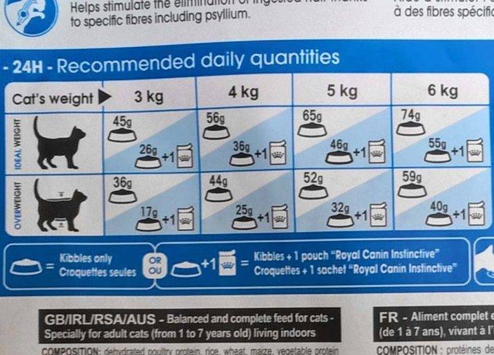 Следующим шагом после выбора специализированного корма для своего питомца будет определение дозировки. Производитель всегда указывает на пачке рекомендуемую порционность в зависимости от веса, возраста, породы и поведенческих особенностей вашего любимца (например, корм для активных кошек, для пожилых). Как правило, на обратной стороне пачки с продуктом размещена таблица, где указывается суточная норма и дозировка в соответствии с весом животного.