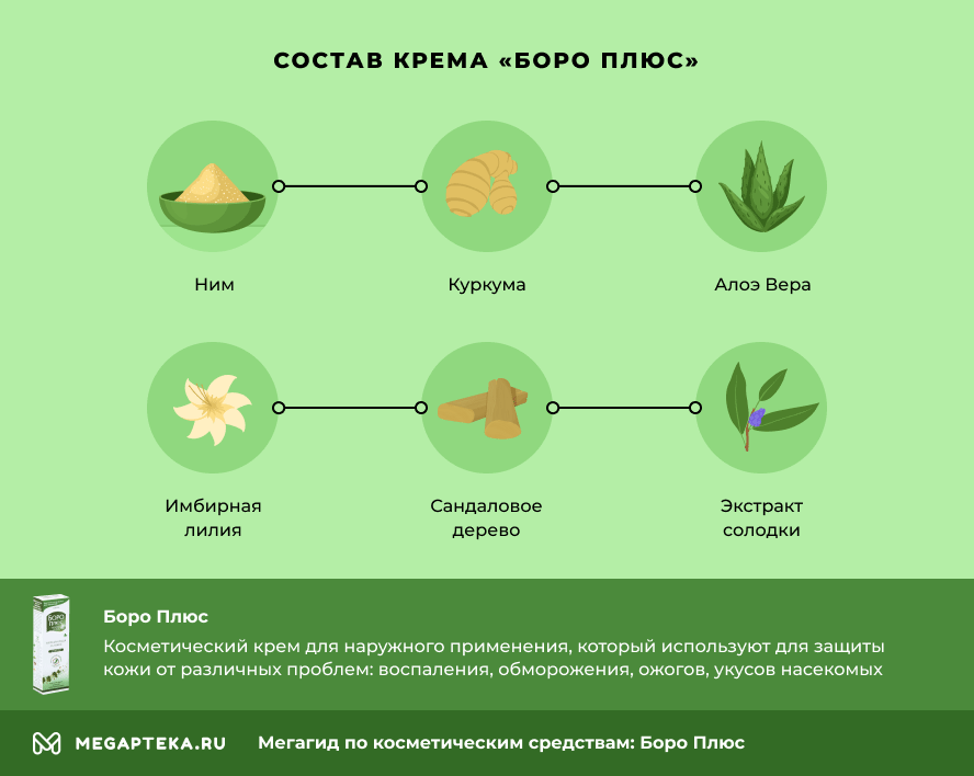 Средство улучшает обмен веществ в организме, устраняет розовые угри, акне, гнойнички, регулирует работу сальных желез. Крем Боро Плюс зеленый устраняет раздражения на лице после бритья, защищает губы от обветривания, предотвращает появление трещин на пятках, увлажняет эпидермис. Показания к применению: